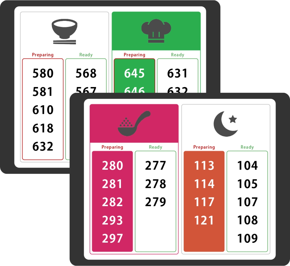 ระบบนี้จะแสดงสถานะการเตรียมอาหารสำหรับแต่ละคำสั่งซื้อ เช่น การสั่งซื้อในร้านอาหารฟาสต์ฟูด หน้าจอสามารถแบ่งออกเป็นสี่ส่วนได้ ช่วยให้ลูกค้าที่มารับประทานอาหารในร้านและพนักงานจัดส่งอาหารแต่ละรายสามารถเห็นภาพรวมได้อย่างชัดเจน หน้าจอจะอัปเดตโดยอัตโนมัติตามขั้นตอนการทำงานของครัว โดยไม่ต้องมีพนักงานป้อนข้อมูล