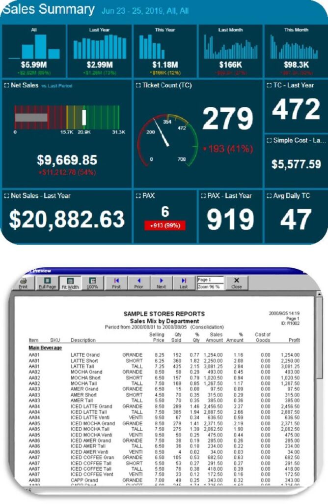 แดชบอร์ดที่ใช้งานง่ายประกอบด้วยรายงานมากกว่า 130 ประเภท ช่วยให้คุณดูข้อมูลยอดขายแบบเรียลไทม์และตัวชี้วัดสำคัญอื่น ๆ ของทุกร้านค้าได้ โดยกระบวนการอัปเดตข้อมูลล่าสุดใช้เวลาไม่เกินห้านาที สามารถส่งออกข้อมูลเป็นไฟล์ PDF หรือ Excel รายงานและแดชบอร์ดใช้งานได้ทั้งบนเบราว์เซอร์พีซีและอุปกรณ์พกพา