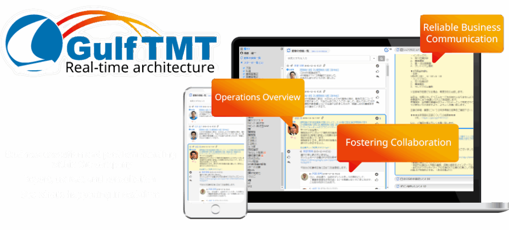 Gulf TMT is a corporate social networking service (SNS) developed specifically for information sharing essential to business operations. Utilizing Gulf TMT, companies with numerous employees operating out-of-office, offices separated across multiple floors, or multiple locations across Japan and the globe can gain real-time visibility into ongoing operations and issues.