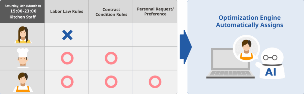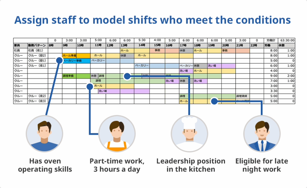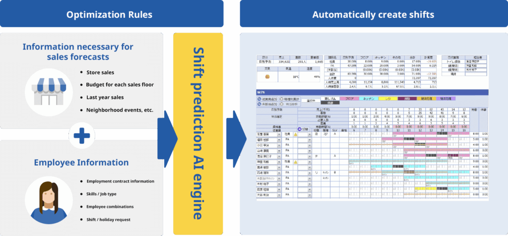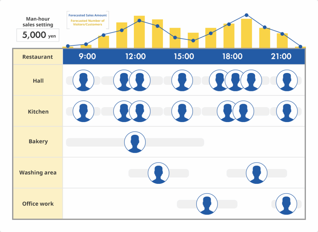 Based on the sales forecast and the sales per labor hour (person-hour sales), the system calculates the optimal number of staff for each position’s model shift.