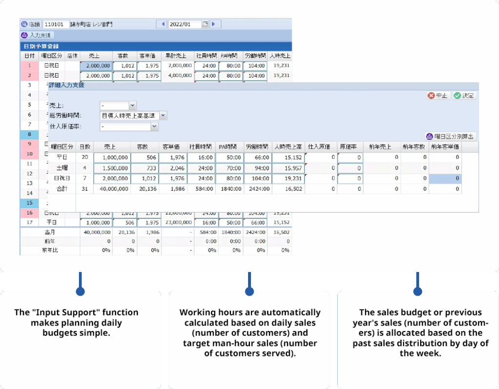 Before creating shifts, first create a budget for daily sales, customer numbers, and working hours. The input support function allows you to expand the monthly budget to daily amounts based on past sales performance.