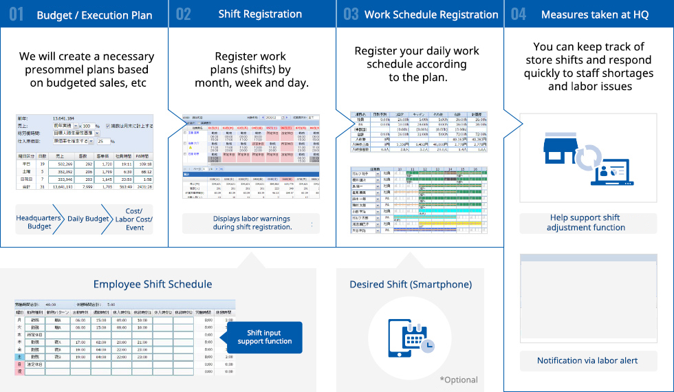 Our system allows you to create staffing plans that align with your budget and sales forecasts. You can register shifts on a monthly, weekly, or daily basis to build your day-to-day work schedule. By displaying the work plan during shift registration, the system enables headquarters to quickly identify and address staffing shortages and other labor issues at individual stores.