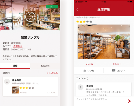 คุณสามารถตั้งค่าวิดีโอให้ต้องยืนยันหรือส่งการตอบกลับได้ ฟีเจอร์นี้สามารถใช้เป็นระบบสั่งงานผ่านวิดีโอได้ ฟังก์ชันการตอบกลับรองรับการแนบวิดีโอ ทำให้สามารถตรวจสอบผลลัพธ์การปฏิบัติงานได้โดยให้พนักงานรายงาน