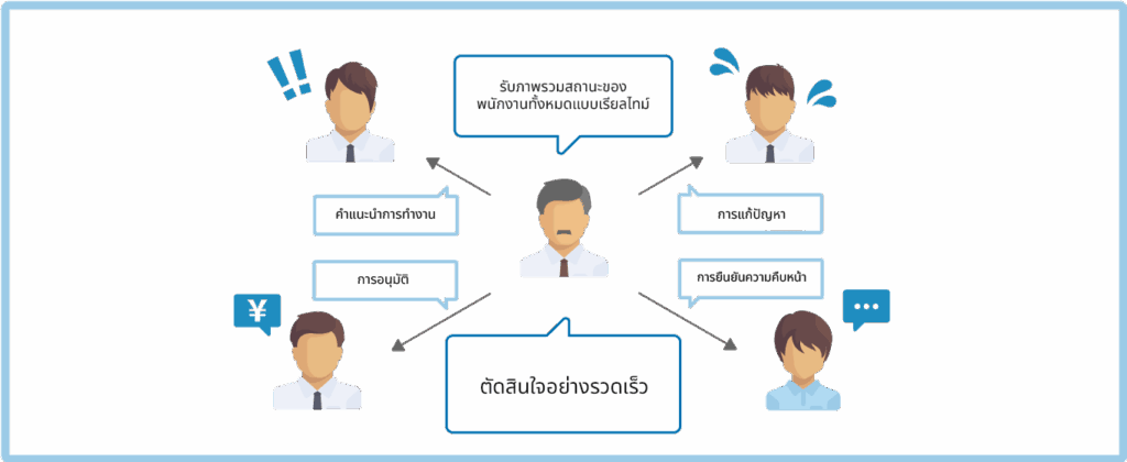 เมื่อมีการโพสต์เพื่อขออนุมัติผู้มีสิทธิ์อนุมัติสามารถใช้ปุ่มเฉพาะบนโพสต์นั้นเพื่อเลือก “อนุมัติ” หรือ “ไม่อนุมัติ” ได้ทันที ซึ่งผู้โพสต์สามารถตรวจสอบได้ว่าใครเป็นผู้ตัดสินใจ เวลาไหน และตัดสินใจแบบใด ขั้นตอนการอนุมัติจึงรวดเร็ว ไม่ซับซ้อน อีกทั้งยังมีตัวเลือกการใช้ตราประทับดิจิทัลควบคู่ได้ด้วย