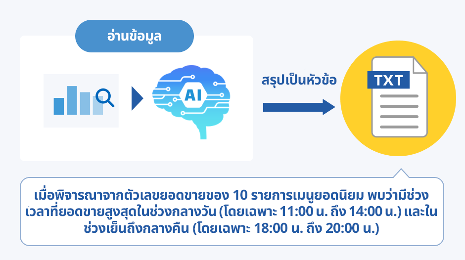 AI จะวิเคราะห์ข้อมูล ดึงประเด็นที่สำคัญ และมอบมุมมองเชิงลึกให้พร้อม ช่วยสรุปเหตุการณ์ที่มักมองข้ามเมื่อดูจากตัวเลขเพียงอย่างเดียว ทำให้เห็นข้อมูลสำคัญเกี่ยวกับการดำเนินงานหน้าร้านและส่วนที่ควรให้ความสำคัญมากขึ้น