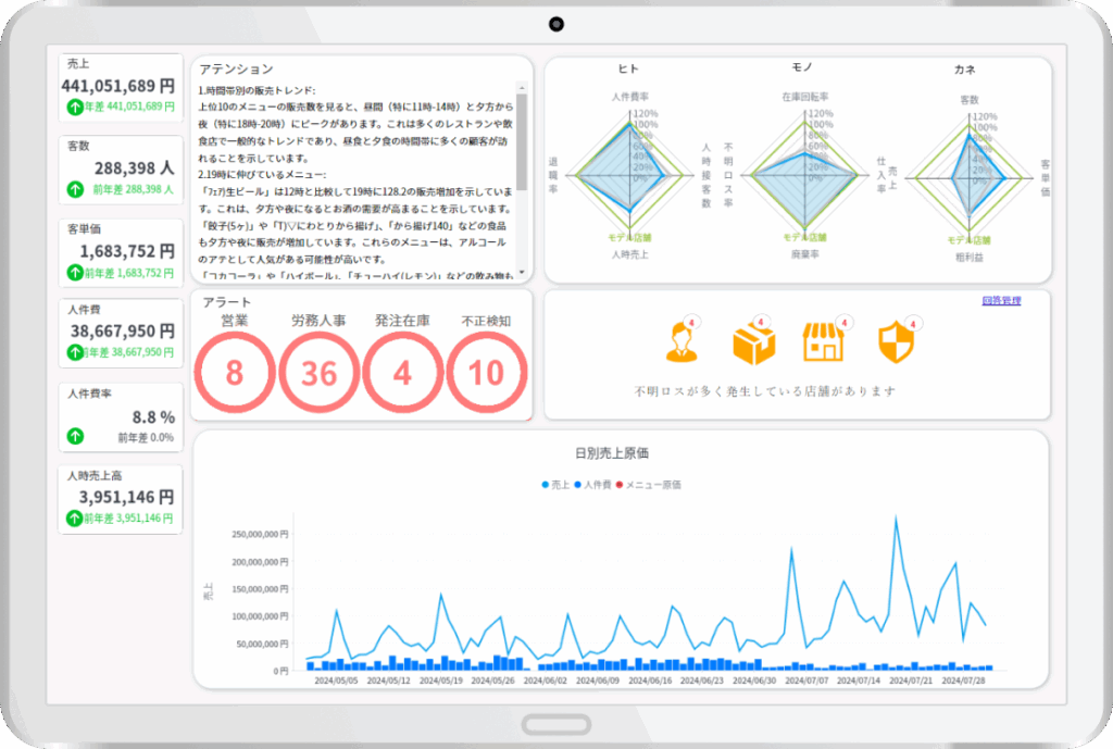 AI จะตรวจจับความผิดปกติจากข้อมูลหลากหลายด้าน ไม่ว่าจะเป็นจำนวนพนักงาน ชั่วโมงการทำงาน ปริมาณออเดอร์ ปริมาณของเสีย ยอดขาย หรืออัตรากำไรขั้นต้น พร้อมทั้งประเมินความเสี่ยงที่อาจเกิดการทุจริต เช่น การแก้ไขข้อมูลเวลาเข้างาน การยกเลิกรายการขายจากระบบ POS หรือความคลาดเคลื่อนของเงินสด เพื่อให้มองเห็นสัญญาณที่ต้องระวังได้ทันเวลา