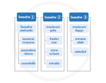 คุณสามารถสร้างโครงสร้างองค์กรหลายแบบ เช่น กลุ่มแยกจากโครงสร้างหลักของบริษัท