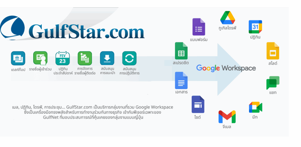 นี่คือฟังก์ชันต่างๆ ของ GulfStar.com ที่รวมทั้งความสามารถของ Google Workspace และฟีเจอร์เฉพาะจาก GulfNet ไว้ด้วยกัน