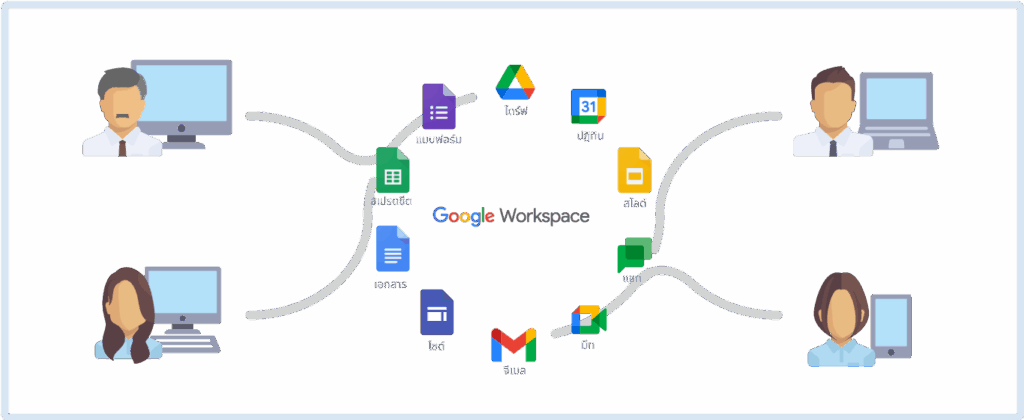 ไม่ว่าจะใช้งานผ่านเบราว์เซอร์บนคอมพิวเตอร์ หรือแอปบนสมาร์ตโฟนและแท็บเล็ตก็สามารถสื่อสารทางอีเมล จัดการตารางงานบน Calendar พูดคุยและประชุมออนไลน์ด้วย Chat และ Meet รวมถึงทำงานบนสเปรดชีตและสไลด์ร่วมกันแบบเรียลไทม์ผ่าน Drive ได้ครบในที่เดียว Google Workspace มาพร้อมความสามารถที่ช่วยขับเคลื่อนงานทั้งภายในและระหว่างองค์กรได้อย่างมีประสิทธิภาพ